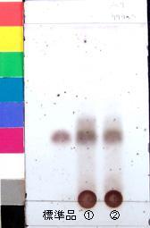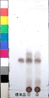 | 備考 | Wako 社製 TLC plate (10cm展開) Rf値 0.36(黄褐色~黒褐色) 展開時間 19分 標準:アルブチン(Arbutin) ①スペイン(2009年6月入手) ②スペイン(2007年9月入手) |