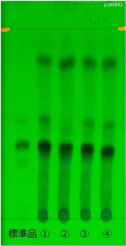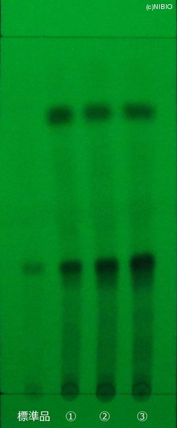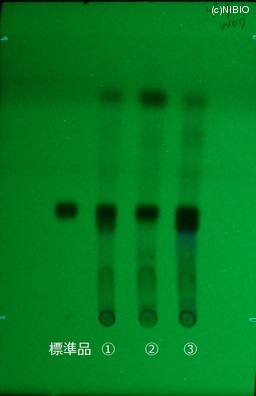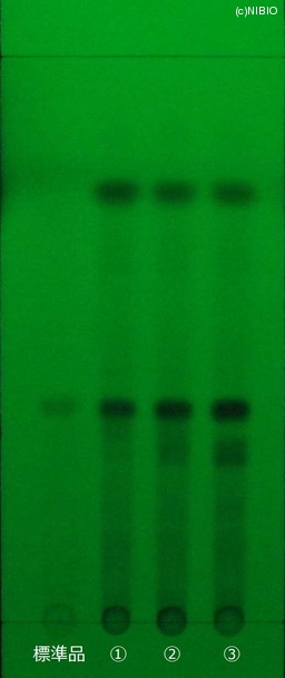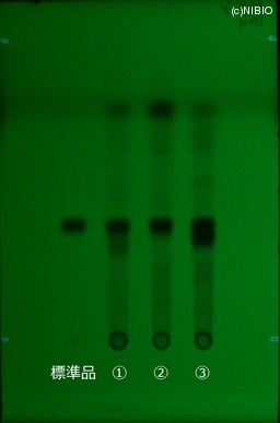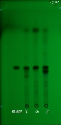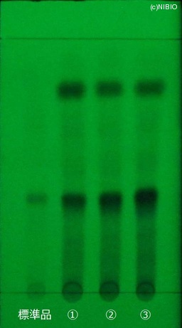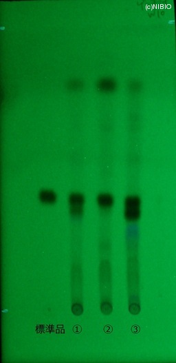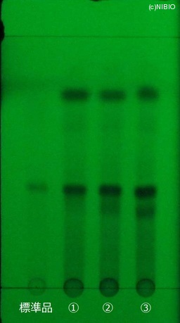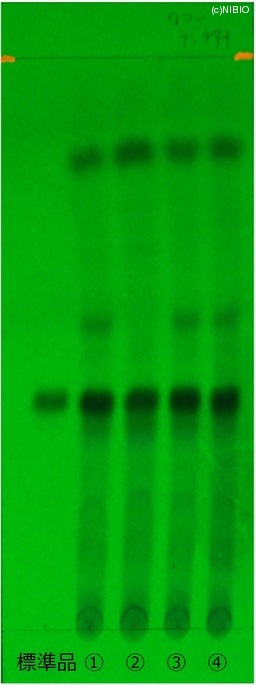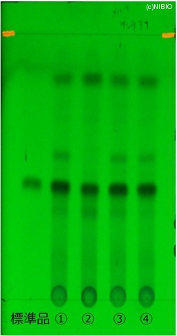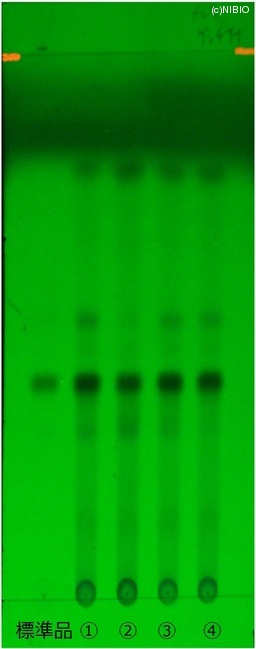 | 備考 | 紫外線(主波長254nm) Merck 社製 TLC plate(10cm展開) Rf値 0.41(暗紫色) 展開時間 22分 標準 ゲンチオピクロシド(Gentiopicroside) ①フランス(2010年入手) ②フランス(2009年入手) ③フランス(2007年入手) ④フランス(2006年入手) |