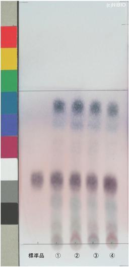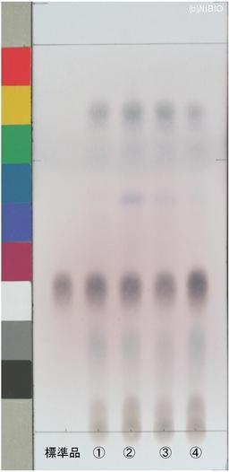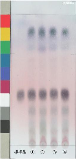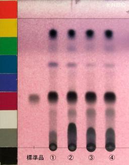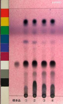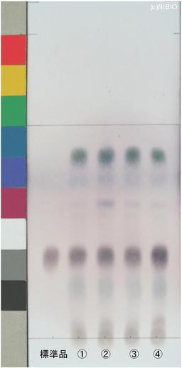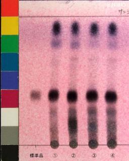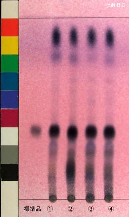 | JP identification memo | Merck社製 7cm展開 Rf値: 0.38 展開時間 8分 標準品 ゲニポシド ①中国 江西省(2011) ②中国 江西省(2011) ③中国 湖南省(2011) ④中国 江西省(2011) |