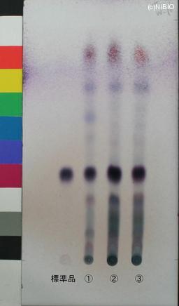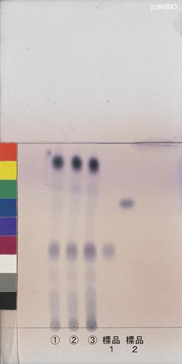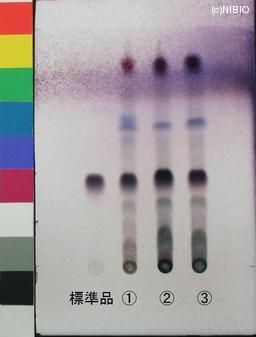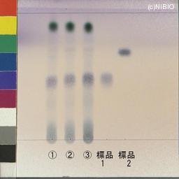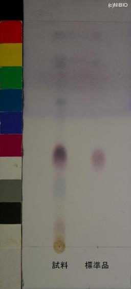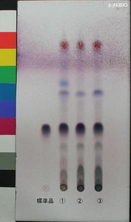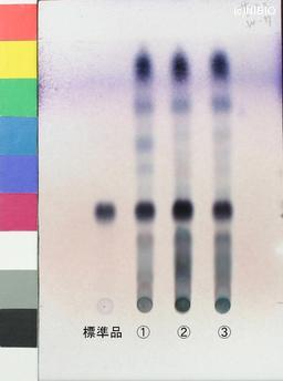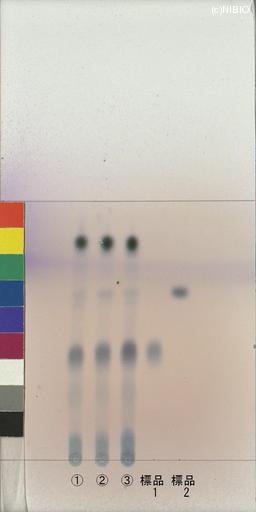 | JP identification memo | Merck社製 7cm展開 Rf値: 0.36 展開時間 11分 標準品 ゲニポシド ①中国 (2007年10月) ②スイシシ 中国 (2008年8月) ③中国 (2010年4月) |