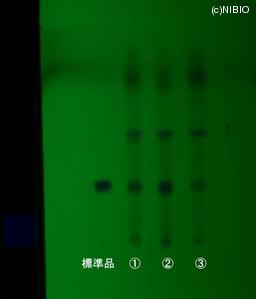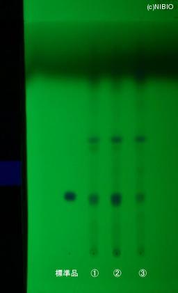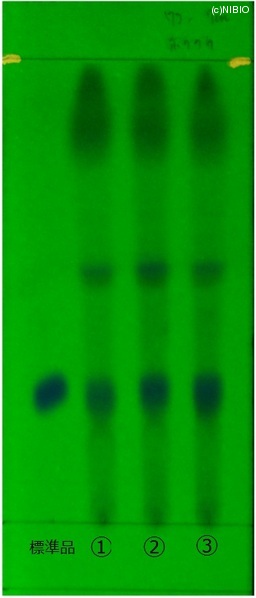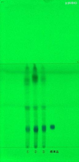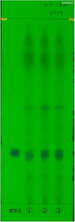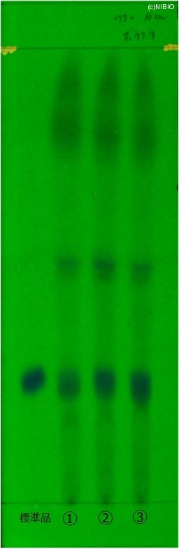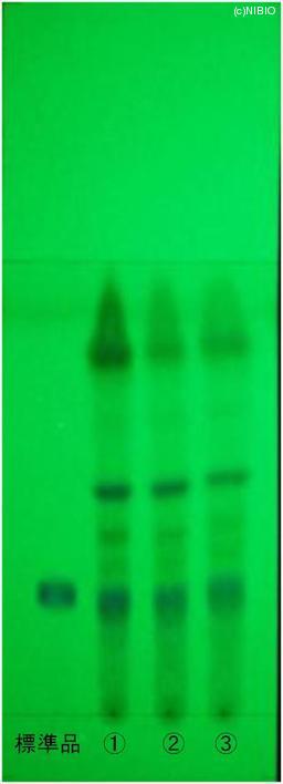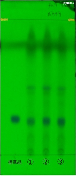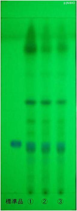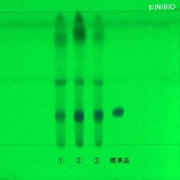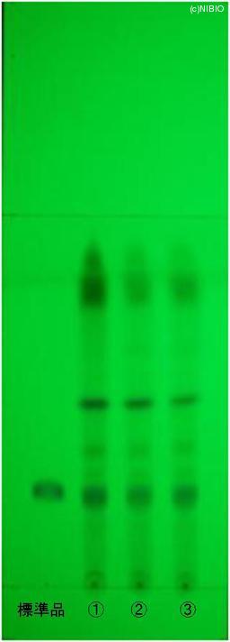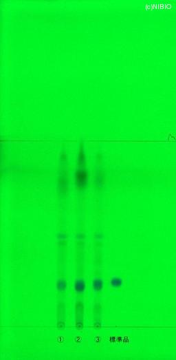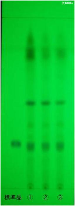 | JP identification memo | Merck 社製 TLC plate(10cm展開) Rf値:標準品 0.24(青色) ①②③ 0.23(青色) 展開時間 23分 標準 4'-O-グルコシル-5-O-メチルビサミノール(4'-O-Glucosyl-5-O-methylvisamminol) ①中国・内蒙古(2008年6月) ②中国・河北省(2010年9月) ③中国・陝西省(2007年8月) |