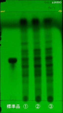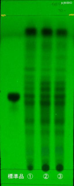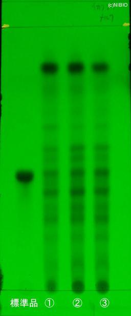 | 備考 | 紫外線(主波長254nm) Merck 社製 TLC plate(7cm展開) Rf値 0.45 (暗紫色) 展開時間 15分 標準 イカリイン(Icariin) ①中国・遼寧(2010年7月入手) ②中国・吉林(2009年2月入手) ③中国・遼寧(2008年2月入手) |