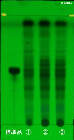 | 備考 | 紫外線(主波長254nm) Merck 社製 TLC plate(10cm展開) Rf値 0.44 (暗紫色) 展開時間 24分 標準 イカリイン(Icariin) ①中国・遼寧(2010年7月入手) ②中国・吉林(2009年2月入手) ③中国・遼寧(2008年2月入手) |