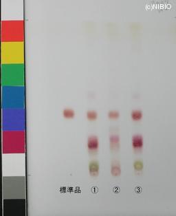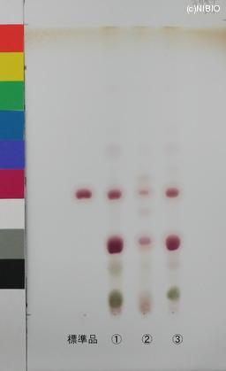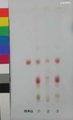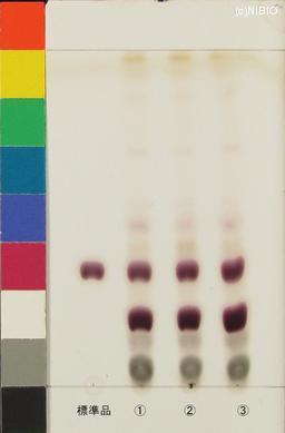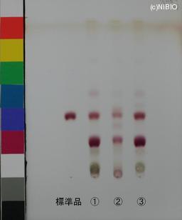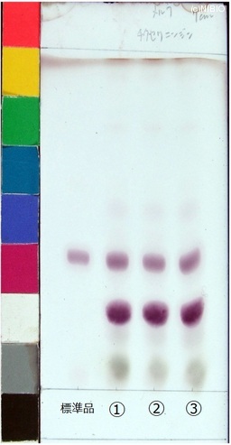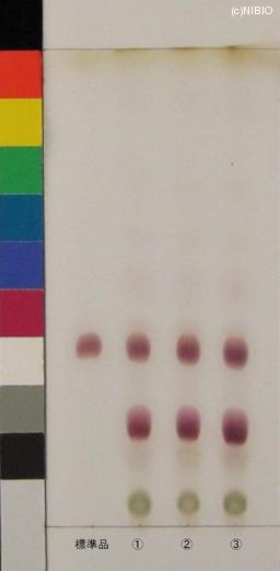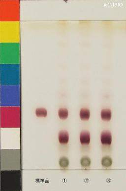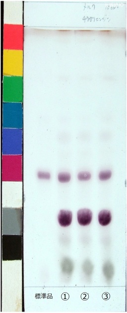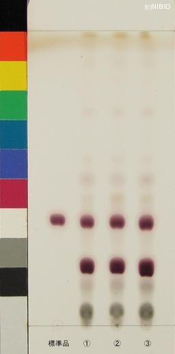 | 備考 | Merck 社製 TLC plate(7cm展開) Rf値 0.39(赤紫色) 展開時間 27分 標準 チクセツサポニンⅣ(Chikusetsusaponin IV) ①日本・秋田(2009年12月入手) ②日本・秋田(2008年11月入手) ③日本・山形(2008年6月入手) |