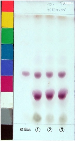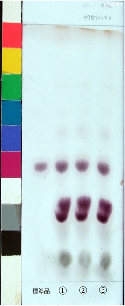 | 備考 | Wako 社製 TLC plate(10cm展開) Rf値 0.45(赤紫色) 展開時間 25分 標準 チクセツサポニンⅣ(Chikusetsusaponin IV) ①日本・秋田(2009年12月入手) ②日本・秋田(2008年11月入手) ③日本・山形(2008年6月入手) |