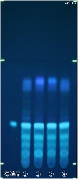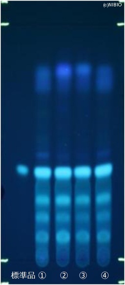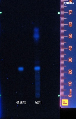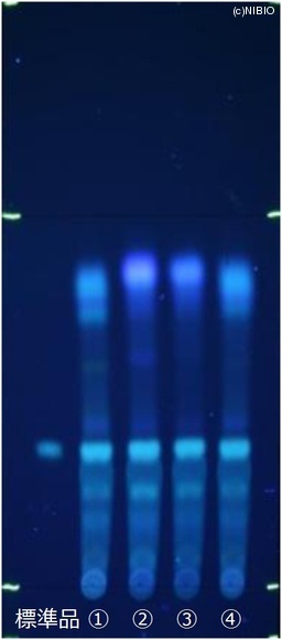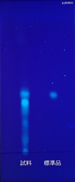 | Analytical Conditions | 本品の粉末2gにメタノール10mLを加え,3分間振り混ぜた後,ろ過し,ろ液を試料溶液とする.別にプエラリン標準品1mgをメタノール1mLに溶かし,標準溶液とする.これらの液につき,薄層クロマトグラフィー〈2.03〉により試験を行う.試料溶液及び標準溶液2μLずつを薄層クロマトグラフィー用シリカゲルを用いて調製した薄層板にスポットする.次に酢酸エチル/メタノール/水混液(12:2:1)を展開溶媒として約10cm展開した後,薄層板を風乾する.これに紫外線(主波長365nm)を照射するとき,試料溶液から得た数個のスポットのうち1個のスポットは,標準溶液から得た青白色の蛍光を発するスポットと色調及びRf値が等しい. |