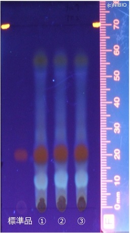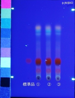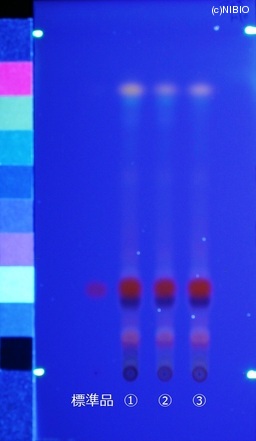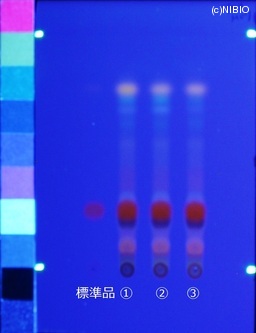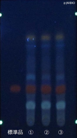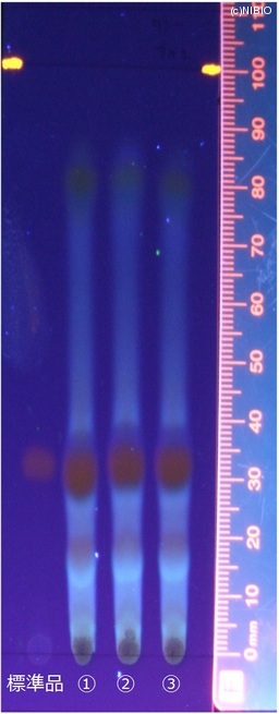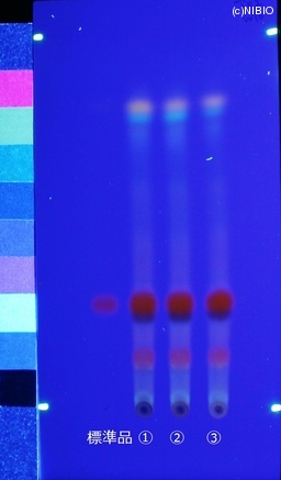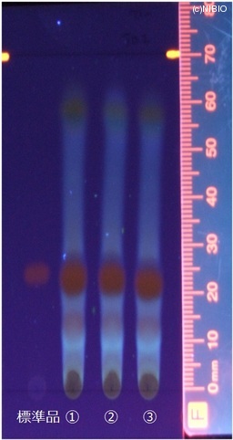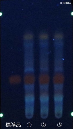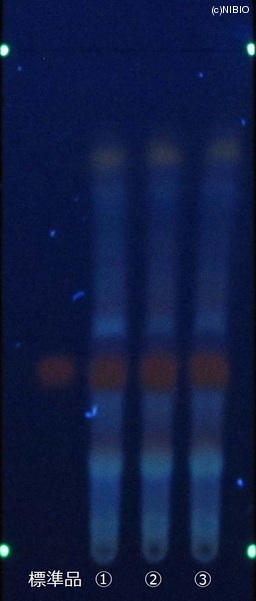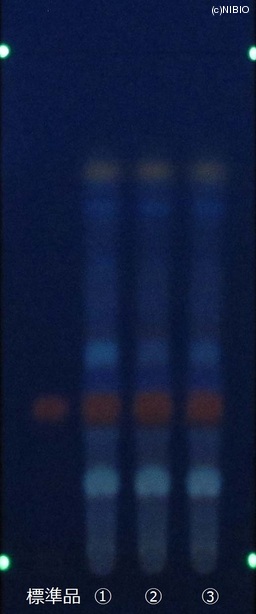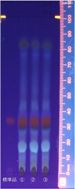 | 備考 | 紫外線(主波長365nm) Merck 社製 TLC plate(10cm展開) Rf値 0.33 展開時間 26分 標準 バルバロイン(Barbaloin) ①南アフリカ(2011年月入手) ②南アフリカ(2010年月入手) ③南アフリカ(2009年月入手) |