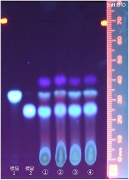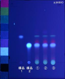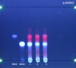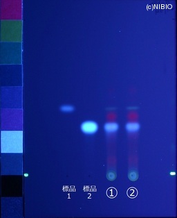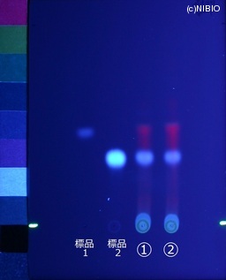 | 備考 | Wako 社製 TLC plate(10cm展開) Rf値: 標準1 標準2 標準品 0.50 0.35 試料① - 0.35 試料② - 0.35 展開時間 12分 標準1 ウンベリフェロン(Umbelliferone) 標準2 スコポレチン(Scopoletin) ①日本・徳島(2009年1月入手) ②日本・徳島(2010年6月入手) |