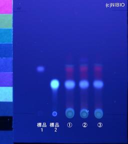 | 備考 | Wako 社製 TLC plate(7cm展開) Rf値: 標品1 標品2 標準品 0.44 0.32 試料① 0.47 0.32 試料② 0.49 0.32 試料③ 0.49 0.32 展開時間 9分 標準品1 ウンベリフェロン (1mg/10mL メタノール)5μL 標準品2 スコポレチン (1mg/10mL メタノール)5μL ①日本(2009年1月) ②日本(2009年10月) ③日本(2010年6月) |