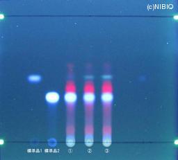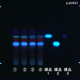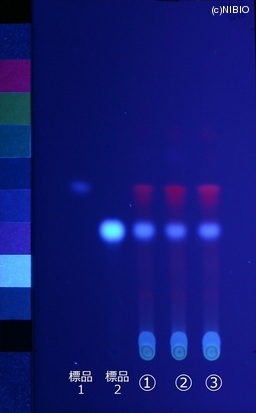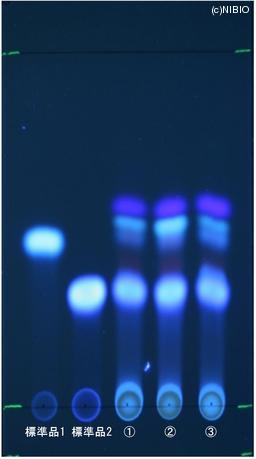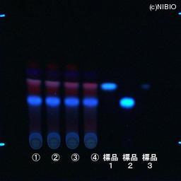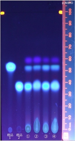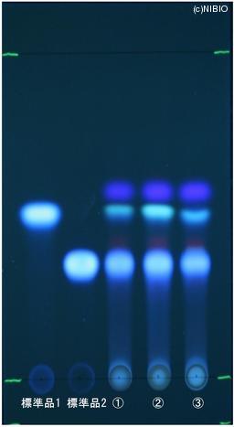 | 備考 | Wako 社製 TLC plate(7cm展開) Rf値 0.44・0.31(青白色の蛍光) 展開時間 7分40秒 標準1 ウンベリフェロン(Umbelliferone) 標準2 スコポレチン(Scopoletin) 標準3 システム適合性用標準液 |