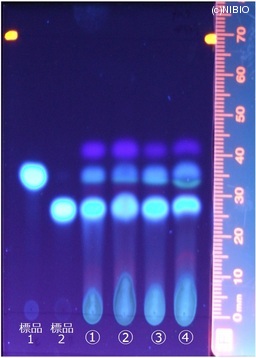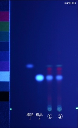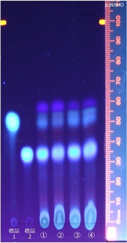 | 備考 | Merck 社製 TLC plate(7cm展開) Rf値 0.51・0.36(青白色の蛍光) 展開時間 8分 標準1 ウンベリフェロン(Umbelliferone) 標準2 スコポレチン(Scopoletin) |