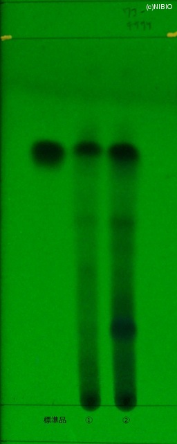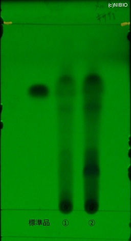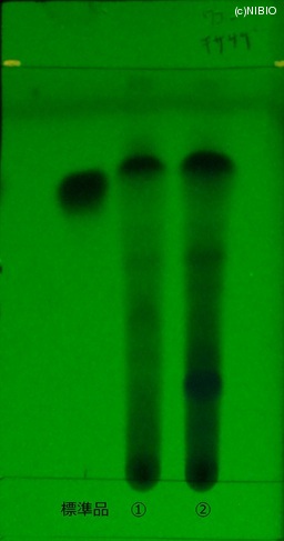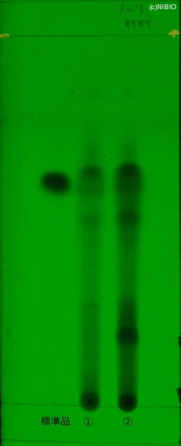 | 備考 | 紫外線(主波長254nm) Merck 社製 TLC plate(7cm展開) Rf値 0.34・0.65(暗紫色・暗紫色) 展開時間 11分 標準 パラオキシ安息香酸(p-hydroxy benzoic acid) ①中国(2009年12月入手) ②中国(2008年12月入手) |