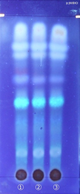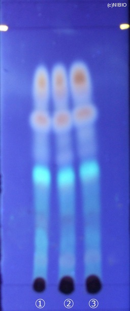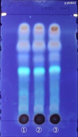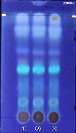 | 備考 | 紫外線(主波長365nm) Wako 社製 TLC plate(10cm展開) Rf値 0.46(青白色の蛍光) 展開時間 13分 ①中国(2008年12月入手) ②中国(2007年11月入手) ③中国(2004年10月入手) |