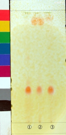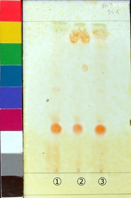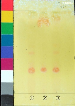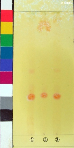 | JP identification memo | Wako 社製 TLC plate(10cm展開) Rf値 0.33(黄赤色) 展開時間 21分 ①日本・長野(2008年7月入手) ②中国(2008年6月入手) ③日本・福井(2005年6月入手) |