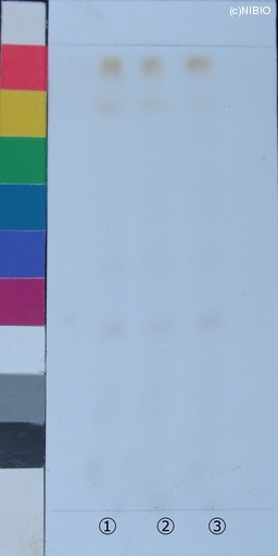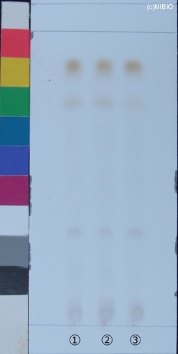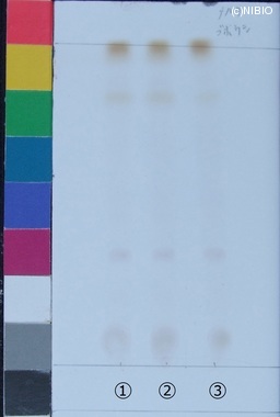 | 備考 | Wako 社製 TLC plate(7cm展開) Rf値 0.43(赤紫色) 展開時間 7分 ①中国(2008年11月入手) ②日本・岩手(2007年11月入手) ③中国(2007年7月入手) |