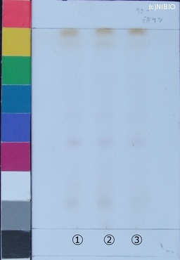 | 備考 | Wako 社製 TLC plate(10cm展開) Rf値 0.40(赤紫色) 展開時間 11分 ①中国(2008年11月入手) ②日本・岩手(2007年11月入手) ③中国(2007年7月入手) |