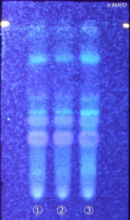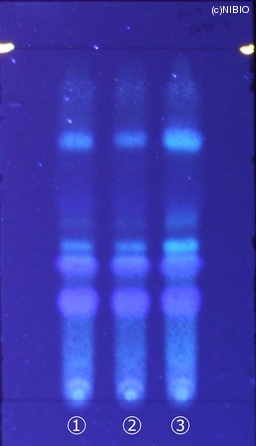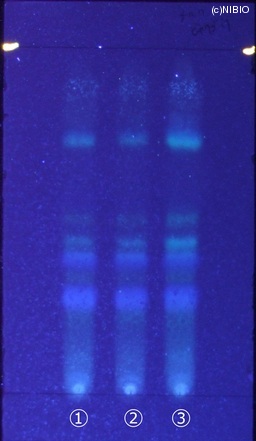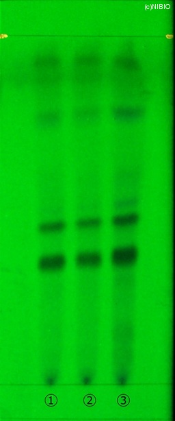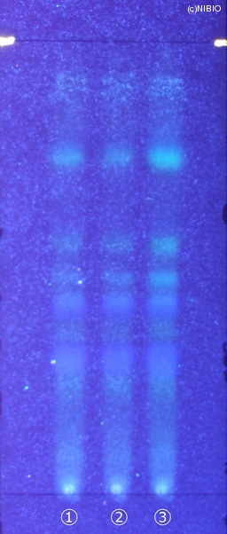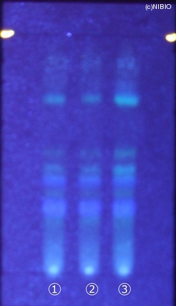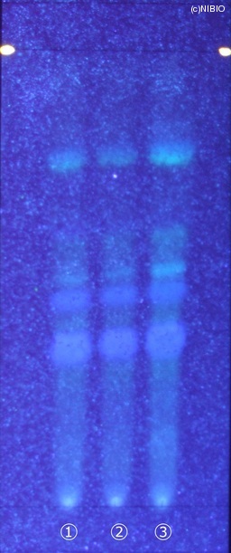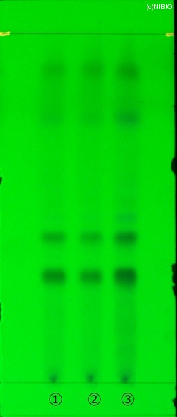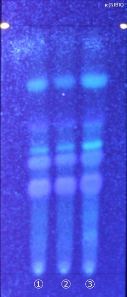 | 備考 | 炭酸ナトリウム噴霧後、紫外線(主波長365nm) Wako 社製 TLC plate(10cm展開) Rf値 0.36・0.45(青紫色の蛍光) 展開時間 16分 ①中国(2008年5月入手) ②中国(2007年2月入手) ③中国(2005年8月入手) |