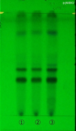 | 備考 | 紫外線(主波長254nm) Wako 社製 TLC plate(7cm展開) Rf値 0.33・0.45 展開時間 10分 ①中国(2008年5月入手) ②中国(2007年2月入手) ③中国(2005年8月入手) ※局方に色の記載なし |