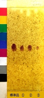 | 備考 | Wako 社製 TLC plate(7cm展開) Rf値 0.59(赤褐色) 展開時間 23分 標準 アレコリン臭化水素酸塩(Arecoline hydrobromide) ①中国(2008年6月入手) ②中国(2007年5月入手) ③ミャンマー(2004年8月入手) |