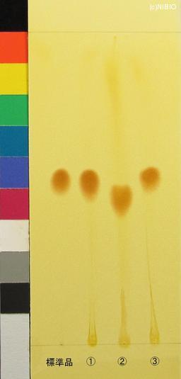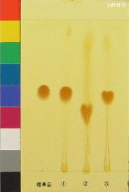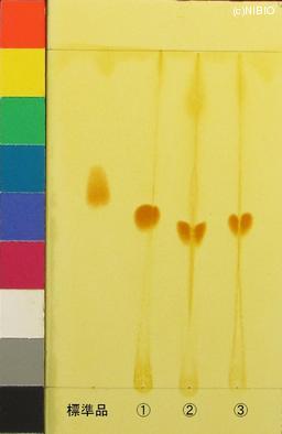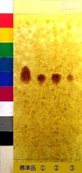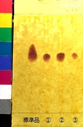| 備考 | Wako 社製 TLC plate(10cm展開) Rf値 0.55(赤褐色) 展開時間 39分 標準 アレコリン臭化水素酸塩(Arecoline hydrobromide) ①中国(2008年6月入手) ②中国(2007年5月入手) ③ミャンマー(2004年8月入手) |