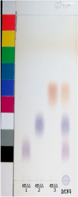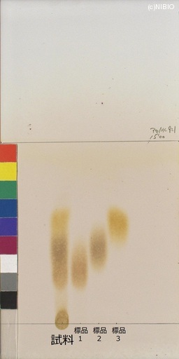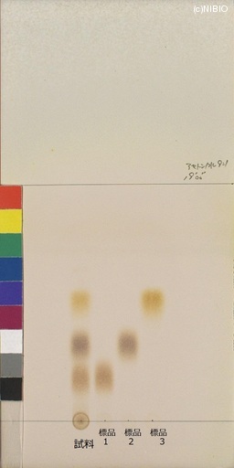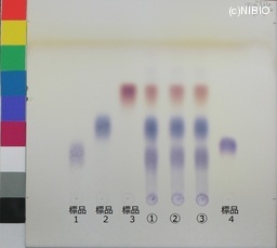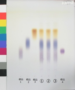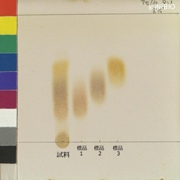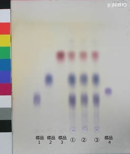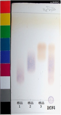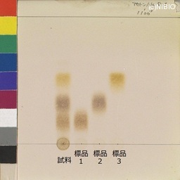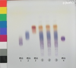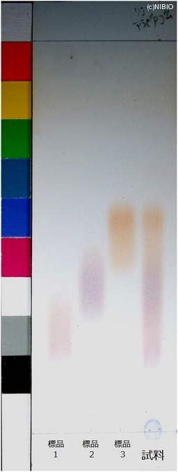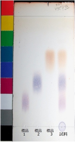 | 備考 | Merck 社製 TLC plate(10cm展開) Rf値 0.24・0.39・0.57 展開時間 16分 標準1 D-ガラクトース(D-galactose) 標準2 L-アラビノース(L-arabinose) 標準3 L-ラムノース(L-rhamnose) 試料:和光純薬製の試薬を使用 |