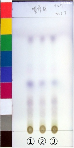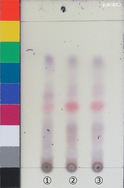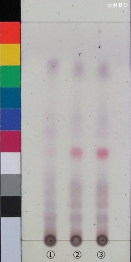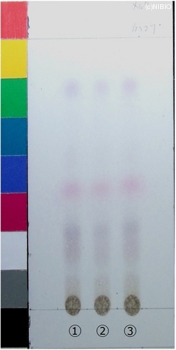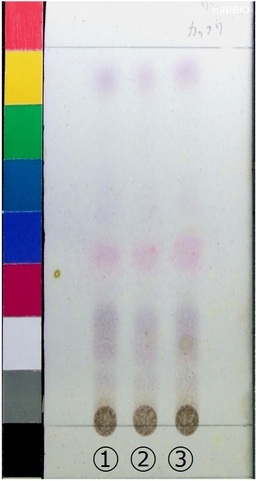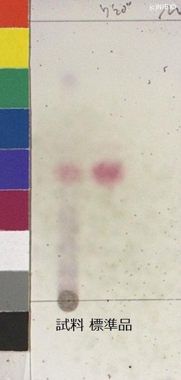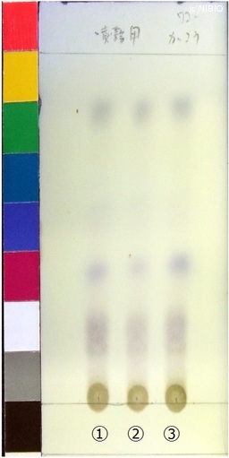 | 備考 | Wako 社製 TLC plate(7cm展開) Rf値 0.45(赤色) 展開時間 7分 ①中国(2011年4月入手) ②中国(2010年11月入手) ③中国(2007年9月入手) |