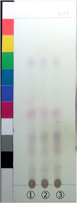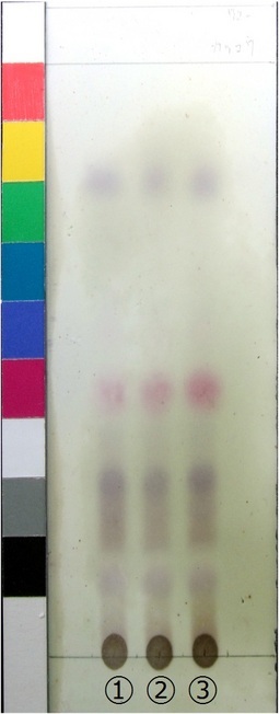| 備考 | Wako 社製 TLC plate(10cm展開) Rf値 0.44(赤色) 展開時間 9分 ①中国(2011年4月入手) ②中国(2010年11月入手) ③中国(2007年9月入手) |