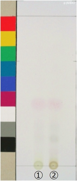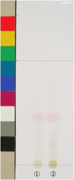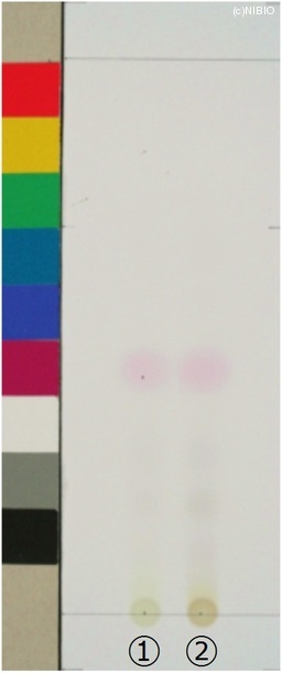 | 備考 | Wako 社製 TLC plate(10cm展開) Rf値 0.41(赤色) 展開時間 11分 ①中国・広西省(2010) ②インド(2010) |