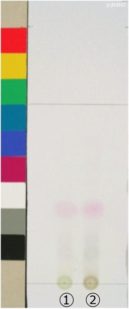| 備考 | Merck 社製 TLC plate(7cm展開) Rf値 0.45(赤色) 展開時間 7分 ①中国・広西省(2010) ②インド(2010) |