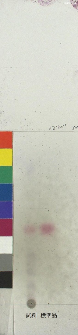 | 備考 | 噴霧試薬変更(噴霧用バニリン・硫酸・エタノール試液) Merck 社製 TLC plate(7cm展開) Rf値 0.41(青紫色) 展開時間 10分 ①中国(2011年4月入手) ②中国(2010年11月入手) ③中国(2007年9月入手) ※局方バニリン・硫酸試液は硫酸濃度が濃く,安全性が問題があることから,16局から収載される噴霧用バニリン・硫酸試液を用いた検出法で検討。スポットの色が青紫色となったが、スポットは確認できた。 |