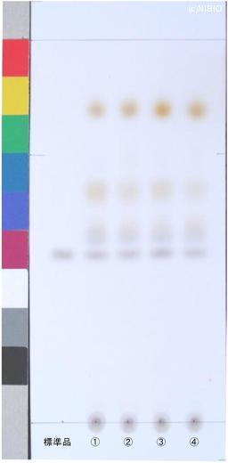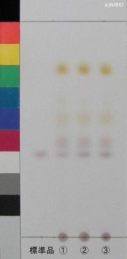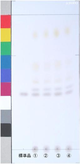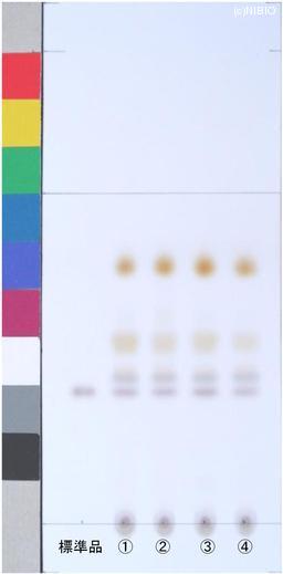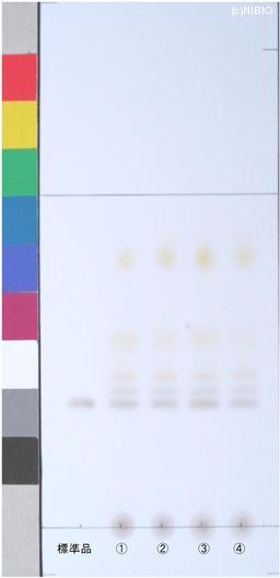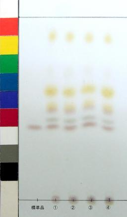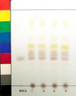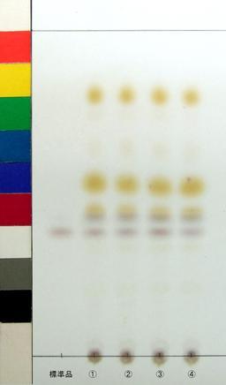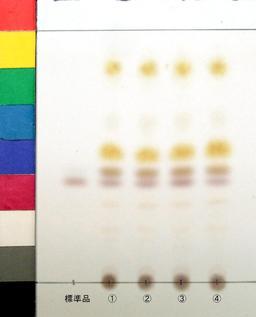 | 備考 | Wako社製 10cm展開 Rf値: 0.41 (褐色) 展開時間 15分 標準品 セサミン ①産地詳細不明(2011年4月) ②産地詳細不明(2010年4月) ③産地詳細不明(2009年12月) ④中国(2007年9月) |