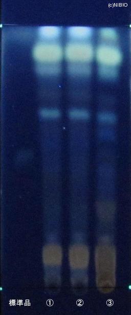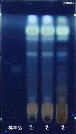 | 備考 | 希硫酸噴霧後加熱UV365nm照射 Wako社製 10cm展開 Rf値:0.50 (緑色蛍光) 展開時間 20分 標準品 |