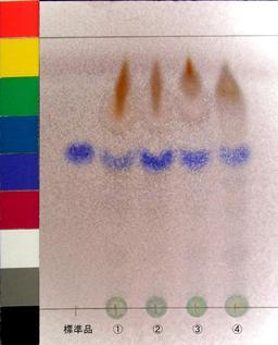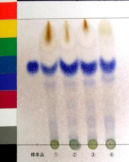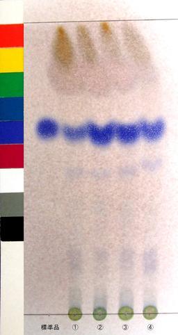 | 備考 | Merck社製 7cm展開 Rf値: 0.54 (青色) 展開時間 9分 標準品 (E)-カプサイシン ①中国(2009年2月)0.153%(カプサイシン含量) ②中国(2010年12月)0.461% ③中国(2006年3月)0.554% ④中国(2001年4月)0.262% |