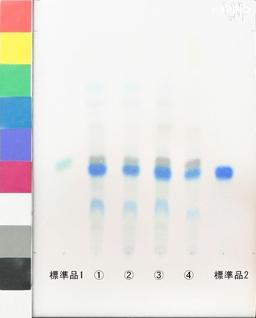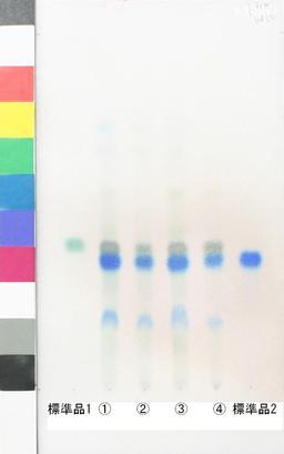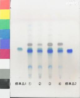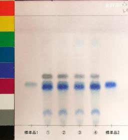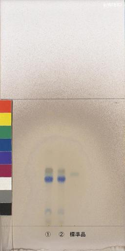 | JP identification memo | Wako社製 10cm展開 Rf値: 0.38 (灰緑色) 展開時間 20分 標準品1 ナリンギン二水和物 標準品2 ヘスぺリジン ①中国(2011年12月) ②中国(2010年4月) ③モロッコ(2008年4月) ④ハイチ(2007年12月) |