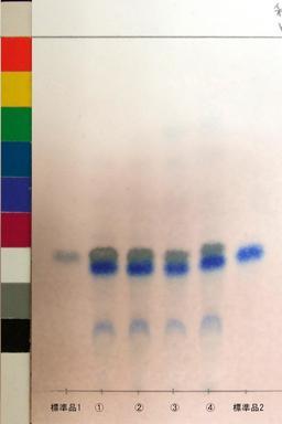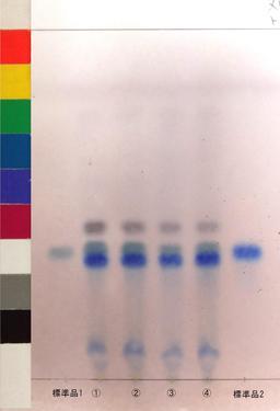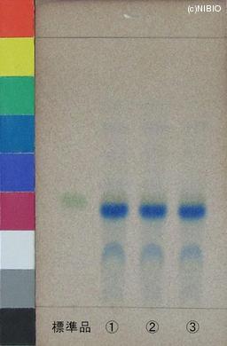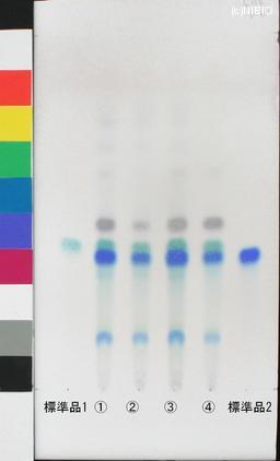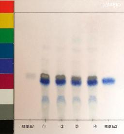 | JP identification memo | Wako社製 7cm展開 Rf値: 0.40 (灰緑色) 展開時間 11分 標準品1 ナリンギン二水和物 標準品2 ヘスぺリジン ①中国(2011年12月) ②中国(2010年4月) ③モロッコ(2008年4月) ④ハイチ(2007年12月) |