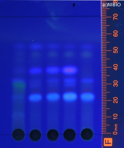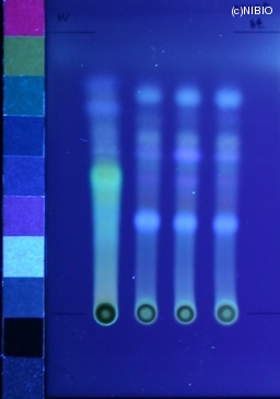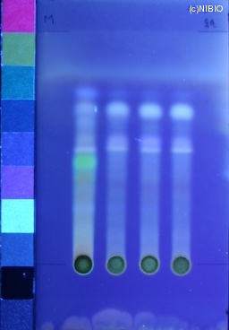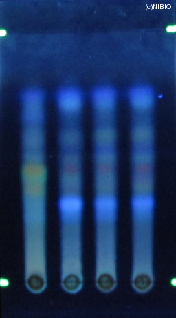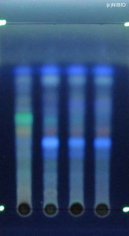 | 備考 | Wako 社製 TLC plate(7cm展開) Rf値 0.42・試料なし 展開時間 9分 標準品 アルテミシア・アルギイ ①韓国(2012年8月) ②韓国(2011年8月) ③韓国(2010年7月) ④日本(2010年1月) |