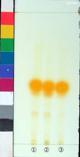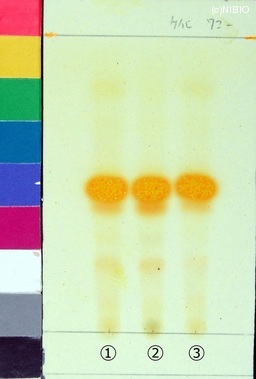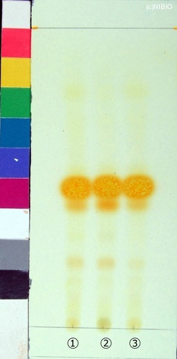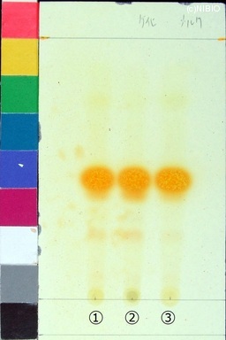 | JP identification memo | Wako 社製 TLC plate(10cm展開) Rf値 0.48(黄だいだい色) 展開時間 9分 ①ベトナム(2009年11月入手) ②中国・広東(2009年9月入手) ③中国・広西(2004年9月入手) |