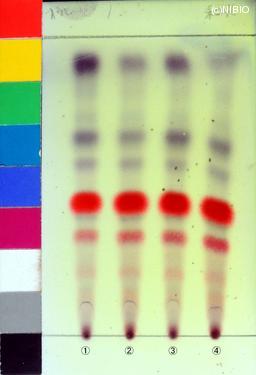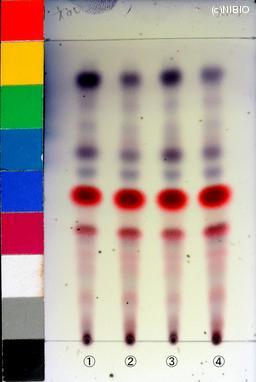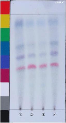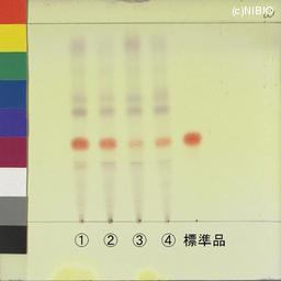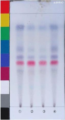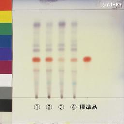| JP identification memo | Merck社製 7cm展開 Rf値:0.48 (紅色) 展開時間 9分 ①日本・徳島 (2008年) ②日本・徳島 (2010年) ③日本・徳島 (2011年) ④日本・宮崎 (2012年) |
