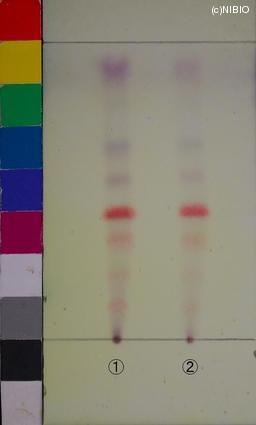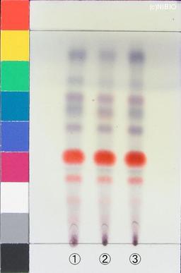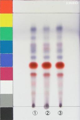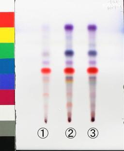 | JP identification memo | Wako社製 7cm展開 Rf値:0.41 (紅色) 展開時間 9分 ①日本・九州 (2006年9月) ②日本・岩手 (2009年6月) ③日本・岐阜 (2011年3月) |
