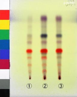 | JP identification memo | Merck社製 7cm展開 Rf値:0.44 (紅色) 展開時間 7分 ①日本産 ②日本産 ③日本産 |