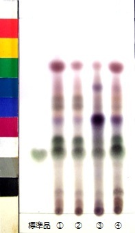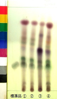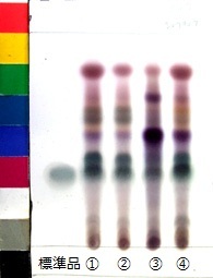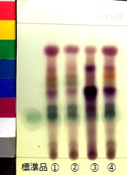 | JP identification memo | Wako 社製 TLC plate(10cm展開) Rf値 0.32(緑色) 展開時間 12分 標準 [6]-ギンゲロール([6]-Gingerol) ①中国・雲南(2008年5月入手) ②中国・広西(2006年4月入手) ③日本(2010年6月入手) ④日本(2010年6月入手) |