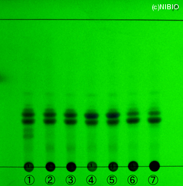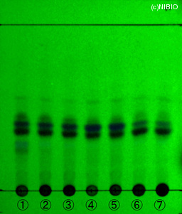 | 備考 | 紫外線(主波長254 nm) Merck 社製 TLC plate(7cm展開) Rf値: 0.39 0.36 0.33 展開時間:9分 ① 日本・長野 ② 日本・岩手 ③ 日本・岩手 ④ インドネシア ⑤ インドネシア ⑥ 中国 ⑦ 中国 |