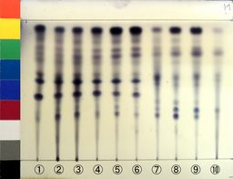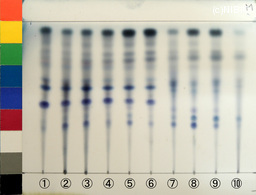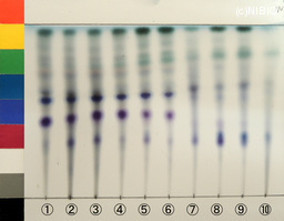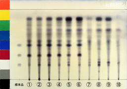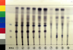 | Analytical Conditions | <参考情報> 調製方法:粉末1 g→ジエチルエーテル10 mL,10分間振り混ぜ抽出 展開溶媒:酢酸エチル/ヘキサン/酢酸(100)混液(10:10:3) 塗 布 量 :5 μL 検出方法:噴霧用バニリン・硫酸・エタノール試液噴霧,105℃5分間加熱、十分放冷 標準品:確認試験用タクシャトリテルペン混合試液 |