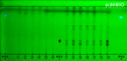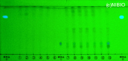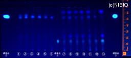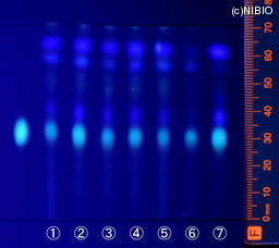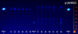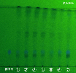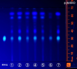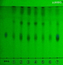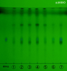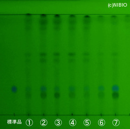 | Analytical Conditions | <参考情報> 調製方法:粉末1 g→メタノール5mL,10分間振り混ぜ抽出 検出方法:紫外線(主波長365 nm)照射 (参 考) 紫外線(主波長254 nm)照射 標準品:4'-O-グルコシル-5-O-メチルビサミノール(1 mg→メタノール1 mL,1 μL塗布) |