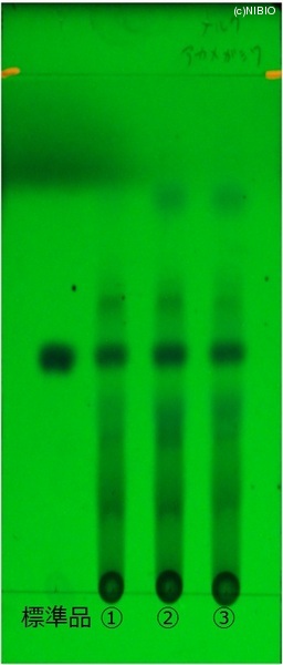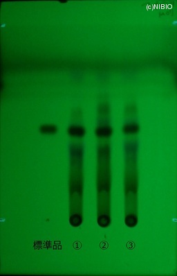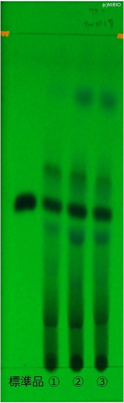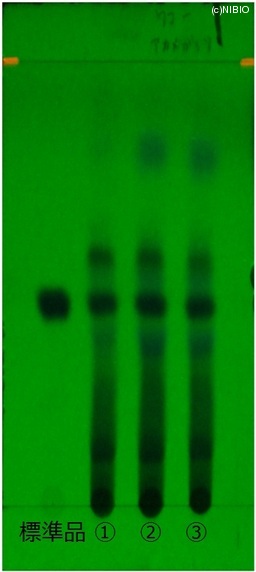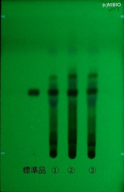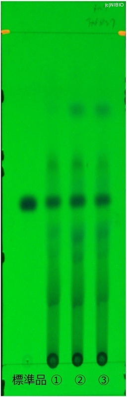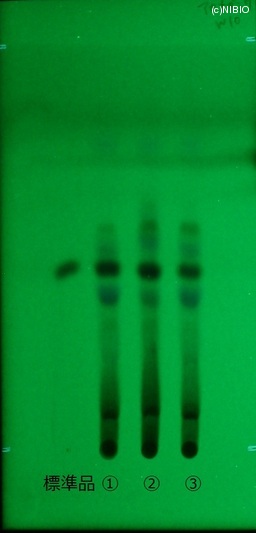 | 備考 | 紫外線(主波長254nm) Merck 社製 TLC plate(7cm展開) Rf値 0.47 展開時間 14分 標準 ベルゲニン (Bergenin) ①徳島(2011年入手) ②鹿児島(2010年入手) ③宮崎(2004年入手) |