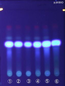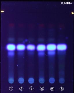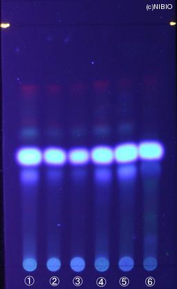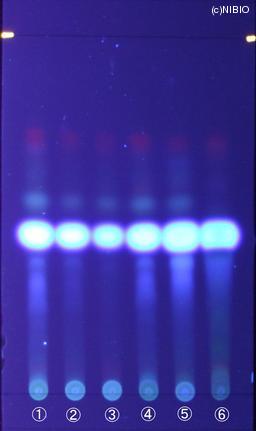 | 備考 | 紫外線(主波長365nm) Wako 社製 TLC plate(7cm展開) Rf値 0.50(青色の蛍光) 展開時間 6分 ①日本・長野(2008年3月入手) ②日本・徳島(2007年12月入手) ③日本・香川(2005年10月入手) ④日本・群馬(2005年1月入手) ⑤中国(2007年2月入手) ⑥中国(2004年12月入手) |