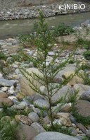 | 形態的特徴 | 半低木状の多年性草本.茎葉は互生し,広く茎を抱き,2〜3回羽状全裂,無毛または密に絹毛がある.茎の中部の葉は,長さ1.5〜9cm,幅1〜7cm.頭花は多数で円すい花序をなし密生する.花期は9〜10月.そう果は周縁花に形成され,倒卵形で長さ0.8〜1.1mm.茎の下部はやや木質化し,高さ30〜100cm. 河岸に自生するものは直立,海岸に自生するものはほ伏状の草姿を示す傾向がみられる.頭花の形は開花ステージにより変化し,頭花の幅には変化がみられないものの開花が進むにつれて長さが大きくなり,球形から卵形に変化する.直立型の頭花は球形,ほ伏型の頭花は卵形であるが,花粉の飛散がみられる時期を過ぎると両者の形に差は認められなくなる. | |||||||||