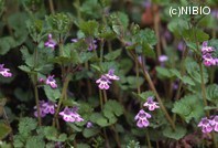 | 形態的特徴 | 株全体に細かい毛があり,倒伏性であるのが特徴である。茎は四角でそう生し,はじめ直立し後に倒伏する.茎は長く伸長し,草丈5〜30cm,長さ1m以上に達し,葉柄およびがくともに開出する毛がある。葉は対生して長い葉柄があり,両面に少し毛がある.長さ1.5cm〜2.5cm,幅2〜3cmの腎形または腎心形,円頭で葉縁には波状の鋸歯がある.春先,長さ15〜25mmの唇形花冠で内部に濃紫色の斑点のある紅紫色の花を葉腋に1〜3個つける.小梗は短く短毛があり,がく裂片は長さ7〜9mmになる.上唇の約2倍の長さになる。果実は楕円形,円頭でわずかに扁平になる.腹面に鈍稜があり,長さ1.8mmで微に凹凸があるが,やや平滑である. 春の萌芽後から開花期まで茎は横に伸び,5月下旬から開花が始まると茎は直立して草丈は30〜50cmとなるが,花が終了すると倒伏して横に伸びる。直立した茎に付く葉は幅3〜4cmになり,横に伸びる茎に付く葉(幅2cm前後〜それ以下)に比べて大きい. | |||||||||||||||||||||