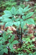 | 形態的特徴 | 高さ0.3~1mになり,地上部はオタネニンジンに酷似する,夏緑性の多年草.根茎は白色でやや太く,タケのような節があり横走し,上面には茎の痕跡が窪んだ状態で残る.節間は短く,1年に1節を形成するだけで,生長は極めて遅い.なお,根茎が竹節状に発達せず直根型となるものも知られている.茎は分岐せず直立し,結実するとともに傾く,葉は3~5個輪生し,トチノキの葉に似ており,掌状複葉で長さ5~10cmの葉柄の先に3~7個の短い柄のある小葉をつける.小葉は倒卵形~倒披針形,膜質で長さ6~30cm,幅2~7cm,縁には細かい鋸歯があり,鋭尖頭,基部は楔形.長い柄の先に球状の散形花序を形成,淡黄緑色の小花を多数つける.花は直径3mmと小さく,花柱はふつう2,雄しべは5.果実は石果で球形,秋に赤熟. | |||||||||
