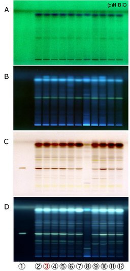| Memo | A. 254nm B. 366nm C. 希硫酸試液(加熱) D. 希硫酸試液(加熱)366nm ①STD.Astragaloside Ⅳ ②NIB-267 ③NIB-298 ④NIB-299 ⑤NIB-300 ⑥NIB-301 ⑦NIB-302 ⑧NIB-303 ⑨NIB-415 ⑩NIB-440 ⑪NIB-643 ⑫NIB-732 |